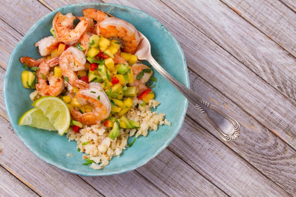• Toss shrimp and cauliflower with salsa. Eat immediately or reserve in fridge for up to 4 days.